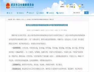 2020年2月1日,武汉市卫生健康委员会官网正式发布:根据中医“治未病”理念,武汉市新型冠状病毒感染的肺炎中医药专家组研究制定了《武汉市新型冠状病毒感染的肺炎中医药居家预防推荐方案》,供广大群众参考。推荐方案包括药物预防、香薰疗法、适度运动三个方面,旨在通过增强人民体质,提升机体免疫力,有效防止疾病扩散流行。