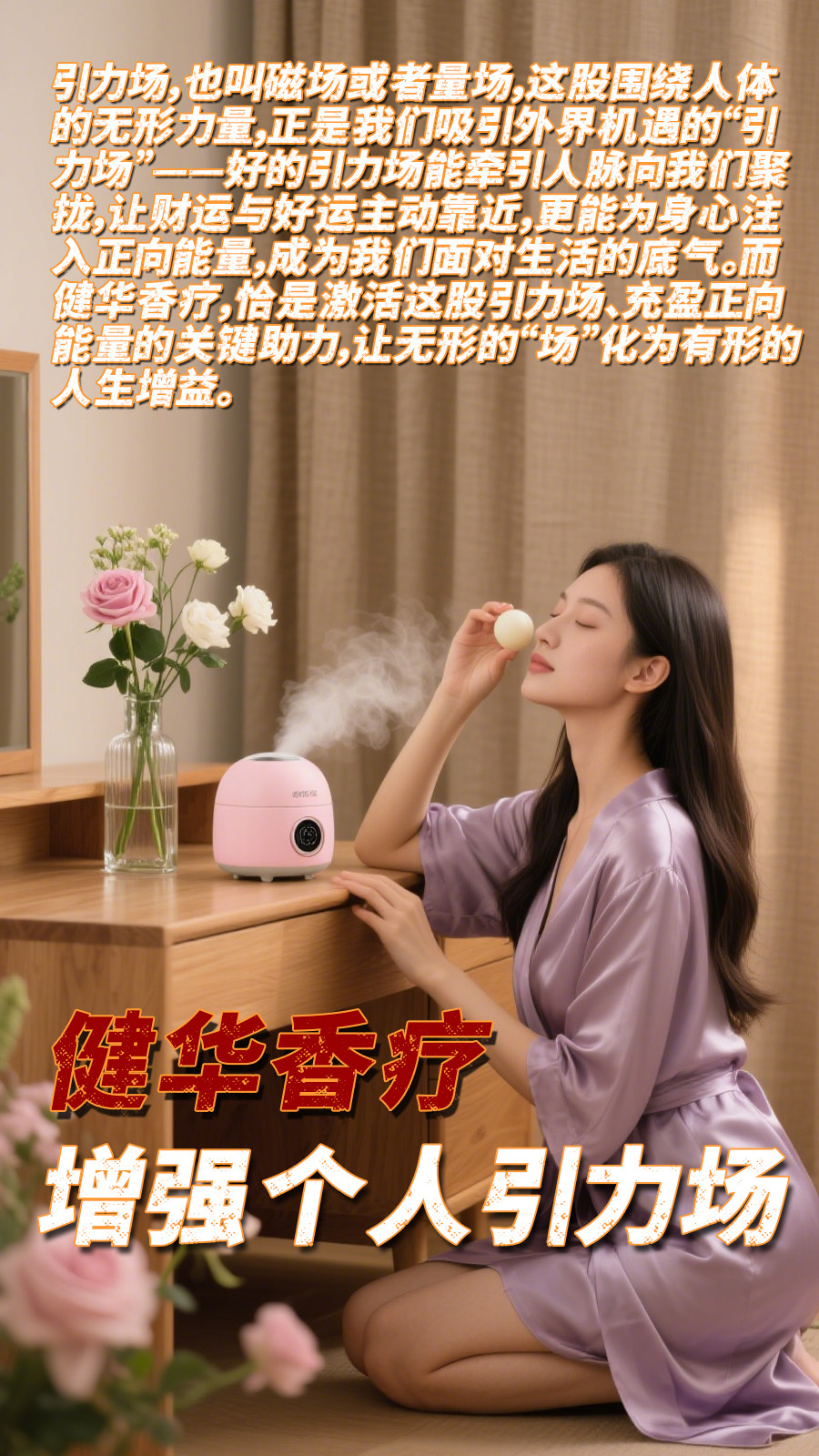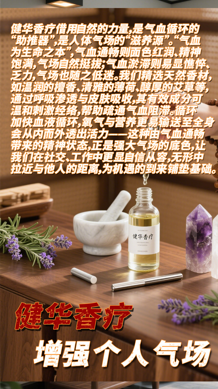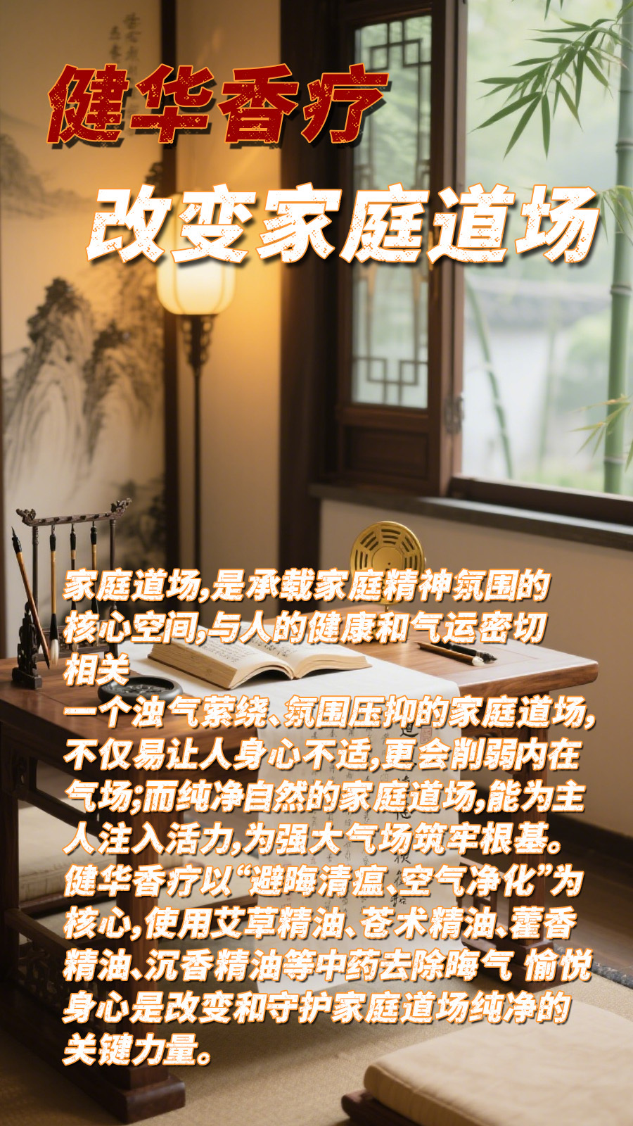 人生有三场,道场、气场、引力场(磁场能量场) 家庭道场是健康运气的“基石”。现代生活中,室内空气污染、甲醛等异味残留、病菌滋生等问题,悄然影响家庭道场的纯净。长期处于不洁净的道场中,各种不适、情绪烦躁,莫名生病等问题随之而来,主人健康状态受损,难以汇聚正向的健康运气。健华香疗通过天然香材的馥郁力量,从源头净化空气——其蕴含的天然抑菌成分可减少空气中的有害微生物,驱散异味与浊气,让每一次呼吸都成为与自然的亲密接触。当家庭道场充盈着清新自然的香气,身体远离污浊侵害,精神也随之舒展,健康运气便有了生长的土壤。